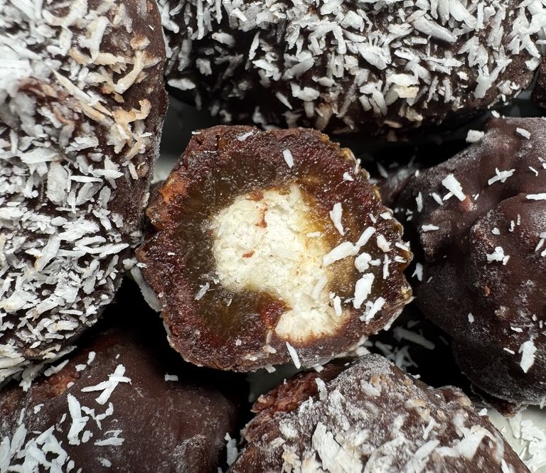 These are made from simple ingredients—coconut, dates, cacao, and maple syrup. There are no fillers or added-sugars, yet they still taste too good. Dates are a good source of fiber, potassium, magnesium, and antioxidants. Coconut (from the oil, shreds, and cream) is rich in healthy fats, electrolytes, fiber, and anti-inflammatory properties. Cacao is full of antioxidants, iron, magnetism, and calcium. Maple syrup is a natural sugar and contain nutrients, such as potassium, calcium, and zinc.
