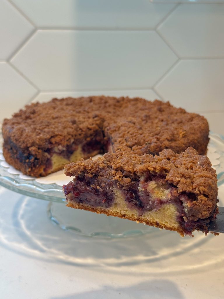 A classic coffee cake, elevated with jammy ripples of berry compote and topped with a thick crumble. Ultra-moist cake with pockets of tangy sweetness and a crisp cinnamon streusel in every bite.