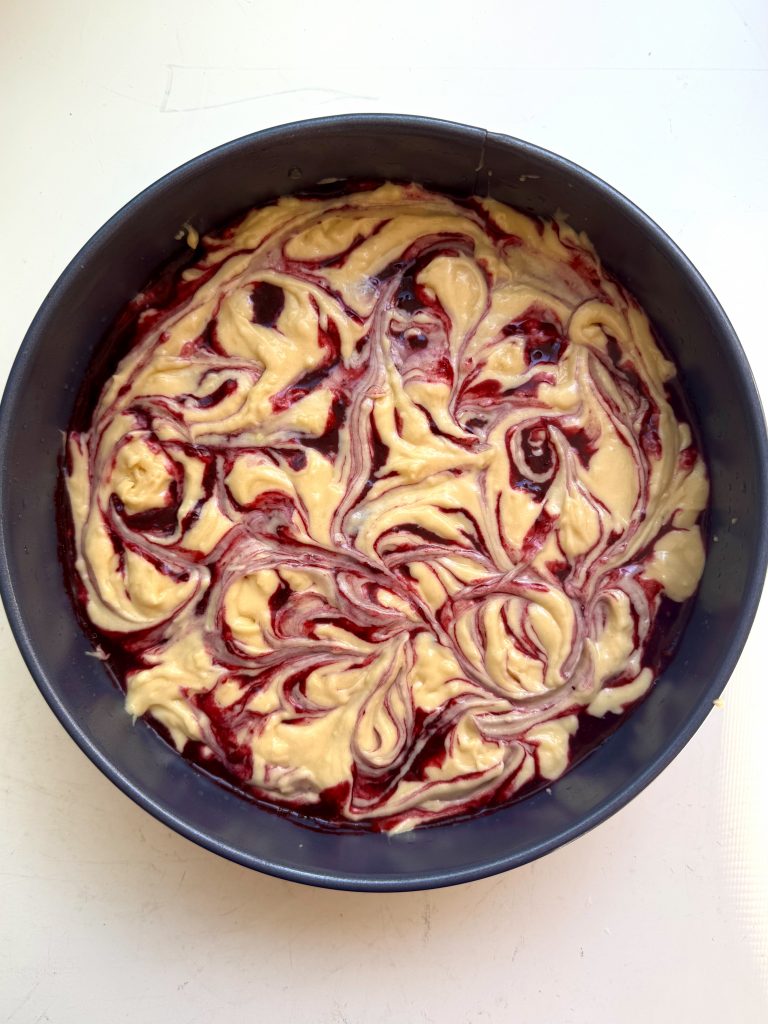 - Pour the cake batter into your pan, followed with the berry compote. Gently swirl the two layers together until there are jammy ribbons throughout the cake. Alternatively, you can switch between pouring in bits of the batter and compote (like 5-6 times) to ensure the layers don’t mix too much together.